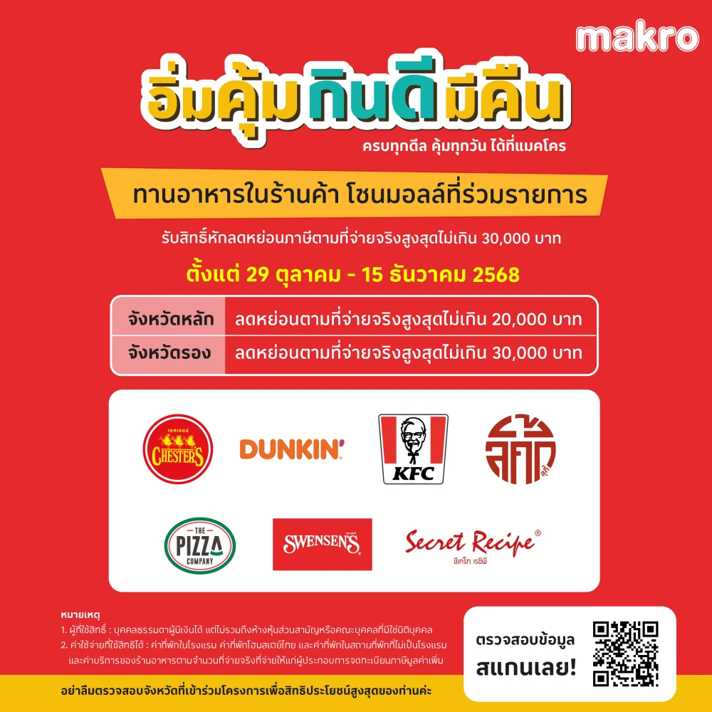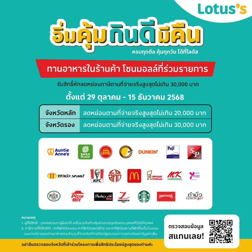 โดยลูกค้าสามารถอิ่มอร่อยกับมื้อโปรดได้อย่างคุ้มค่า พร้อมรับสิทธิ์คืนภาษีจากโครงการ “เที่ยวดีมีคืน” ได้ทันที เพียงรับประทานอาหารภายในร้านค้าที่ร่วมรายการ ภานในโซนมอลล์ของแม็คโครและโลตัสทั่วประเทศ ตั้งแต่วันที่ 29 ตุลาคม – 15 ธันวาคม 2568 โดยรวบรวมร้านอาหารชื่อดังและร้านยอดนิยมให้ลูกค้าเลือกอร่อยได้ทุกมื้อ ทั้งอาหารไทย ญี่ปุ่น เกาหลี ของหวาน และคาเฟ่หลากหลายแบรนด์ รับสิทธิ์หักลดหย่อนภาษีตามที่จ่ายจริงสูงสุดไม่เกิน 30,000 บาท สามารถดูรายละเอียดเพิ่มเติมได้ที่ Facebook : makro – แม็คโคร และ Facebook : Lotus’s – โลตัส